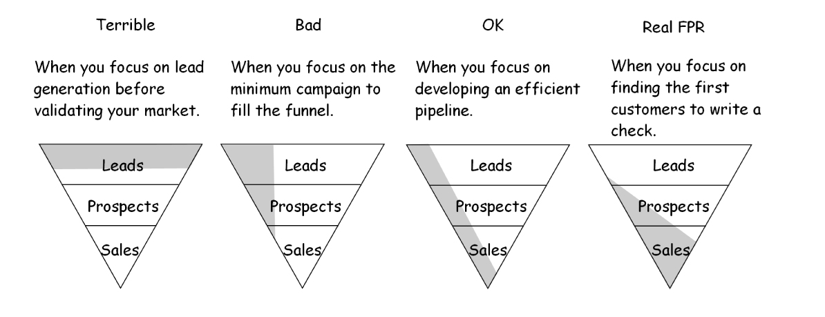 The second pitfall is focusing on what might be called the “minimum viable campaign”, which centers on filling the funnel just enough to generate initial sales. This seems smart but misses the purpose of the FPR. The goal is first and foremost to validate the market for your product, not to test and adapt your prospecting pipeline.
